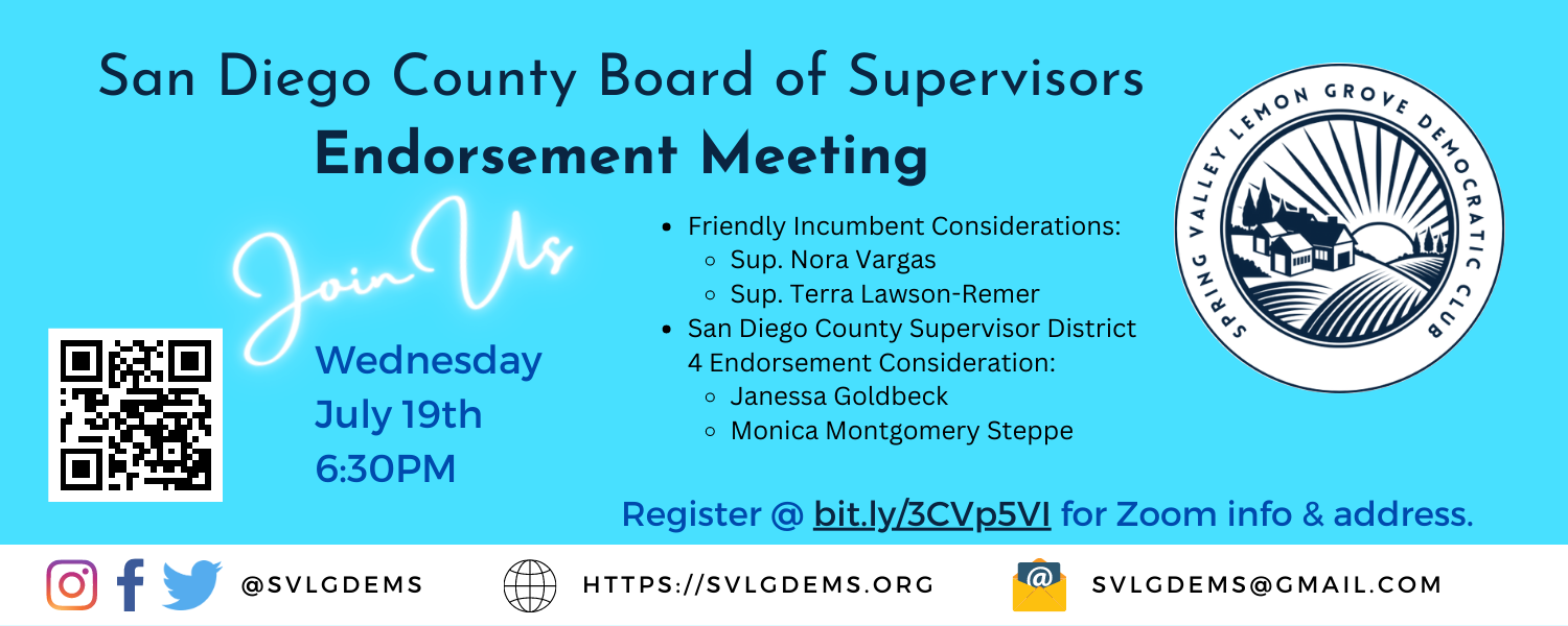 Tonight our club will attempt to endorse in the San Diego County Board of Supervisor, District 4, Special Election. There are 2 Democrats in the race and both will be considered for endorsement by the club.