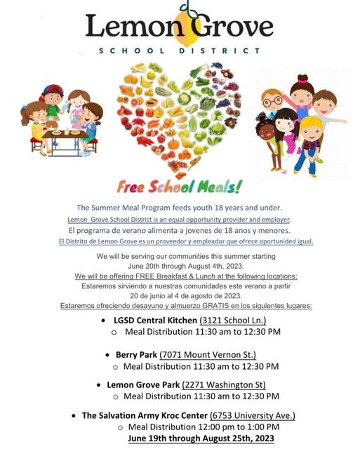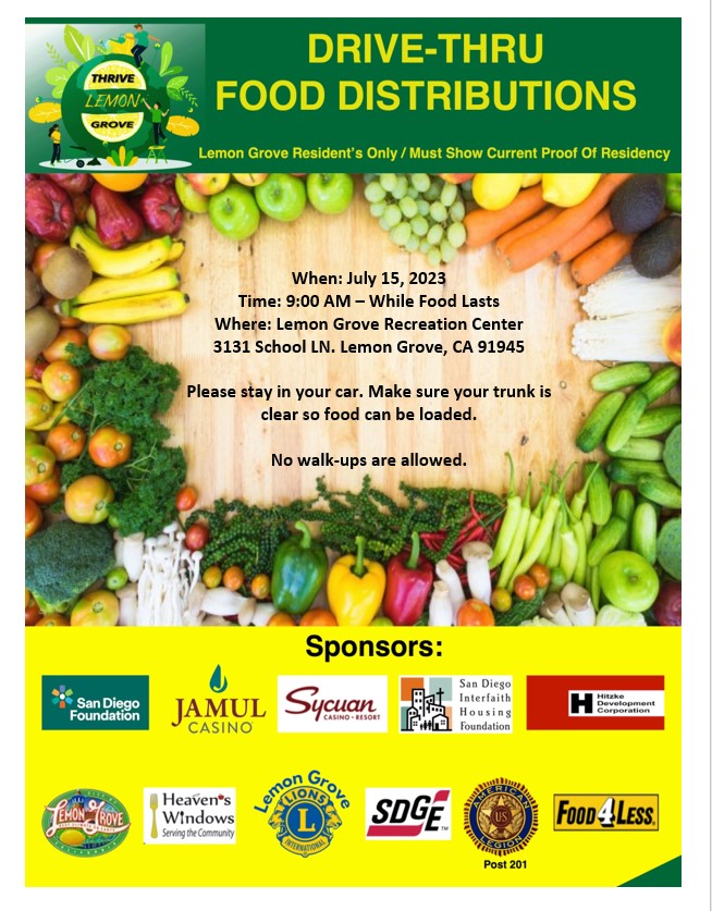 | The City of Lemon Grove hosts a monthly food distribution along with several partnering organizations. Please see the attached flyer for more information.