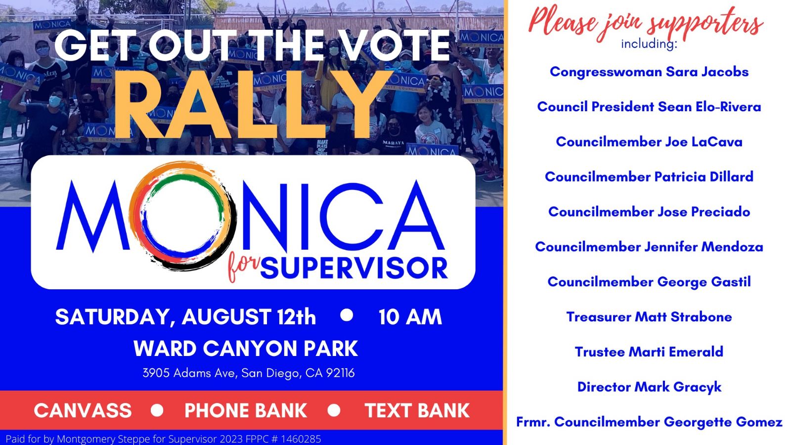 Tomorrow morning, Monica’s Campaign is hosting a Get Out the Vote Rally in Ward Canyon Park at 10am. Several elected officials from all over the County are going to be there in support, including Congresswoman Sara Jacobs, San Diego City Council President Sean Elo-Rivera, and Lemon Grove Councilmembers Jennifer Mendoza and George Gastil.