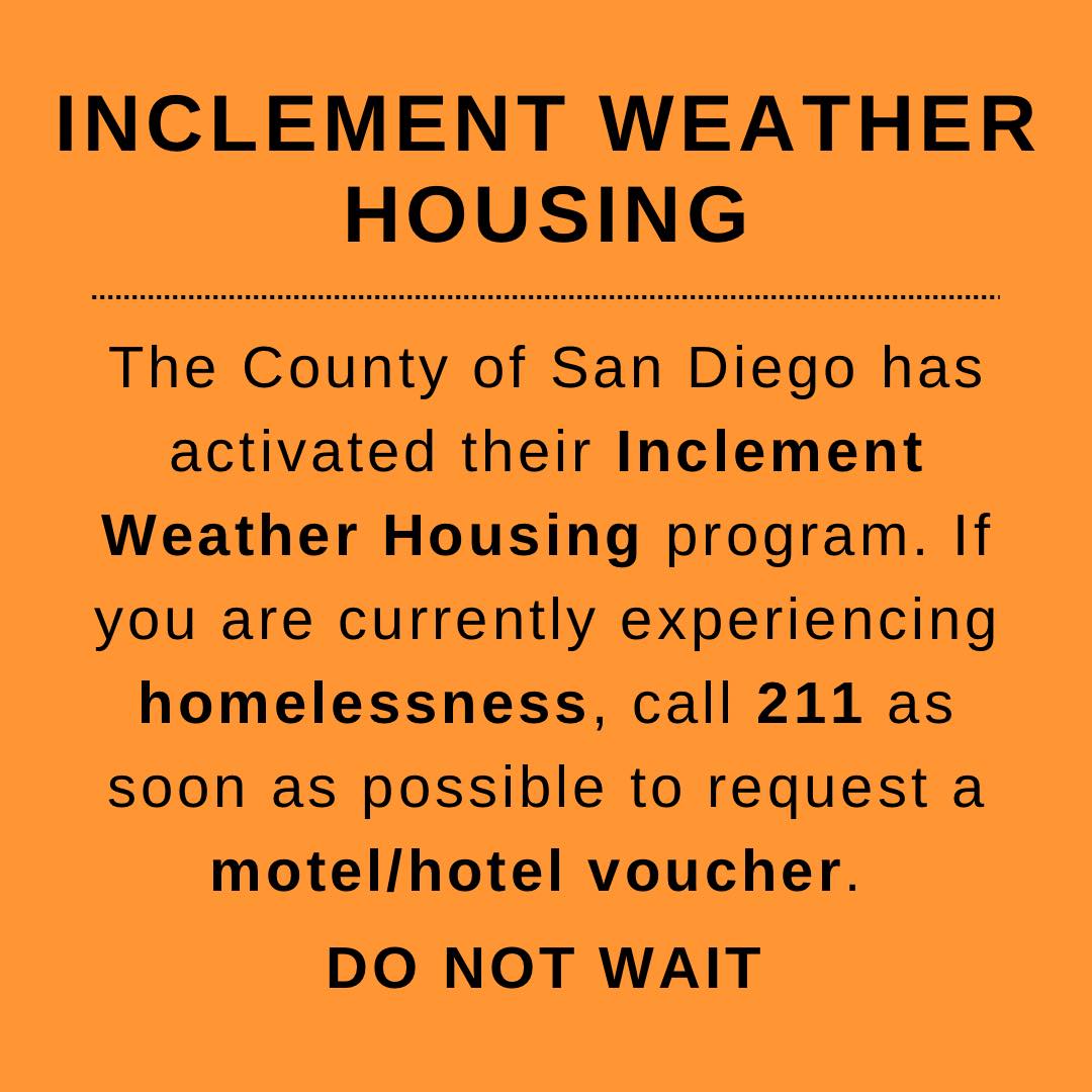 If you know anyone who is experiencing homelessness, the County of San Diego has implemented their inclement weather program. All unhoused people and families can call 2-1-1 to request a motel/hotel voucher.