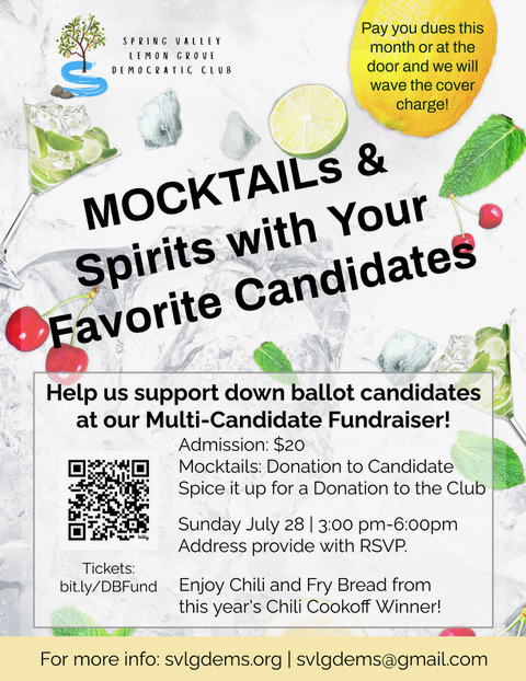 This Sunday, July 28th at 3:00 PM, our club will be hosting a multi-candidate fundraiser specifically for candidates in down ballot races. A General Admission Ticket to our fundraiser is $20 and a portion of the proceeds will be split with the candidates.