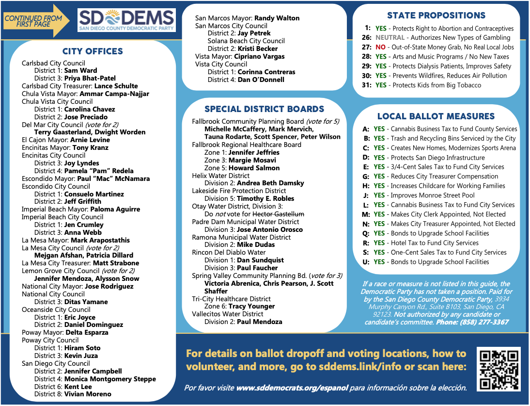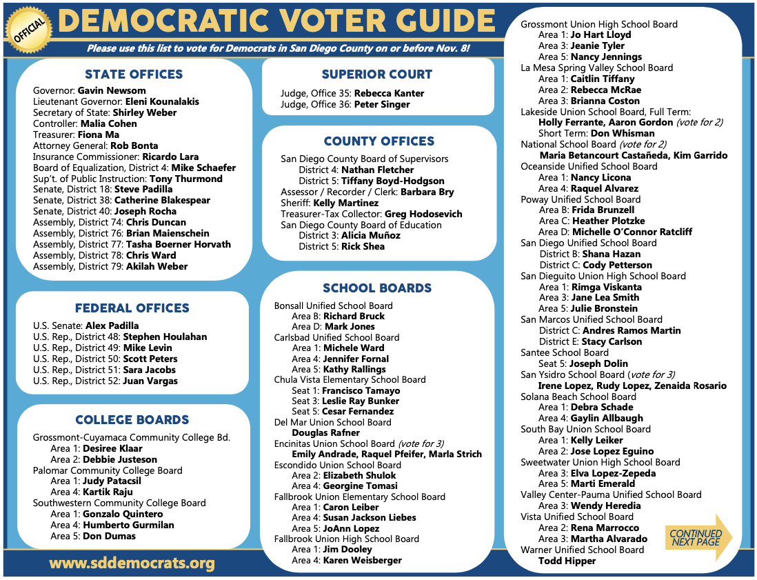 On Saturday, October 15th, 2022, a quorum of our club membership voted to endorse in the remaining State, Local, and County Wide races, with the position held by the San Diego County Democratic Party. You may find additional San Diego County Democratic Party endorsements at sddemocrats.org.